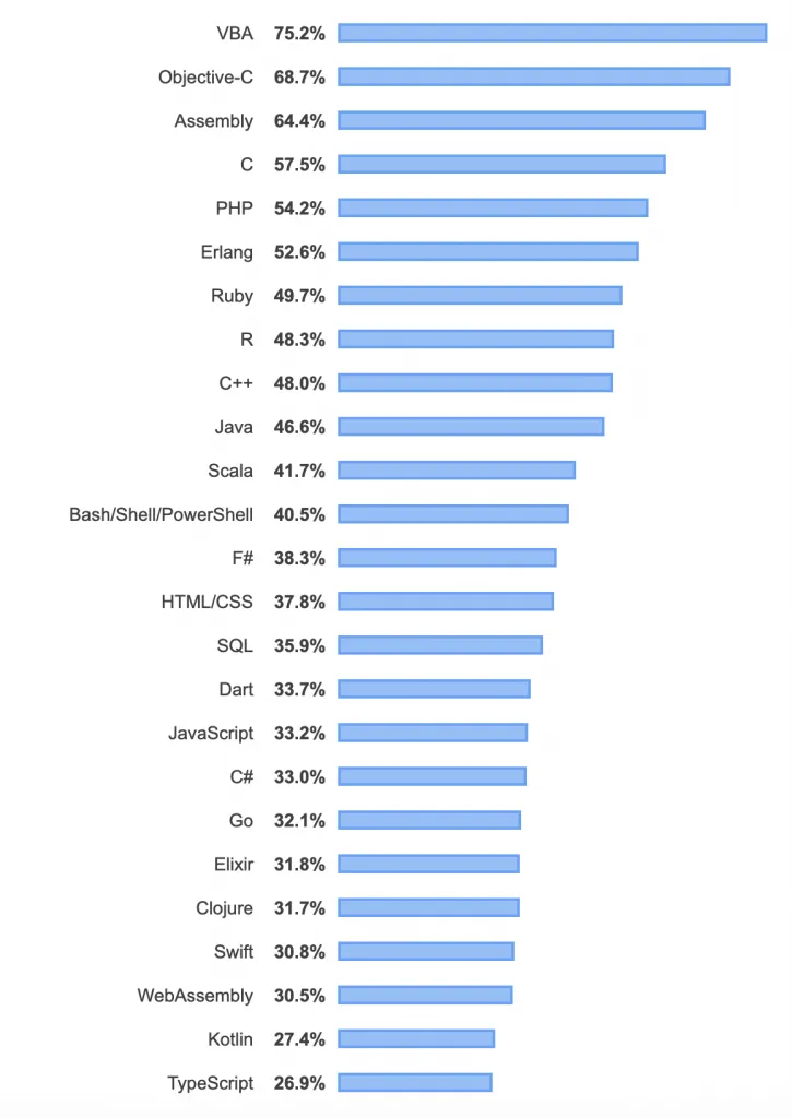 Go actually makes the most dreaded chart, but close to the bottom. I suspect most of the hate is salty Java devs that have been forced to move to Go and give up their precious objects. They had to give up generics as well up until now, but we’ll have generics in Go in 1.18.